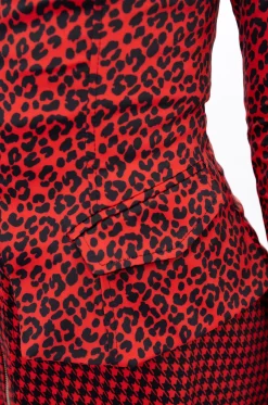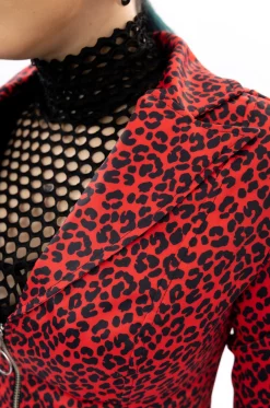 • Elaborado en tejido plano con apariencia satinada, sublimado con estampado de leopardo en tonos rojo y negro.