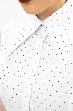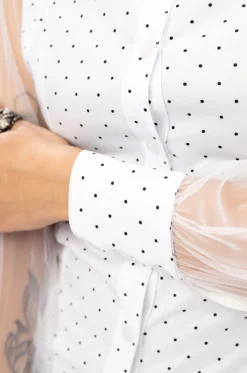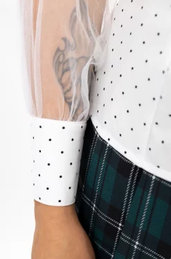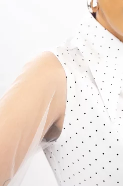 •Cuerpo, cuello y puños en Rolex sublimado con mini print de puntos negros sobre base blanca.