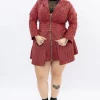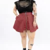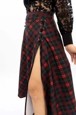 • Abertura profunda en la pierna izquierda, decorada en la parte superior con ojaletes entrelazados con una tira de cuero sintético.