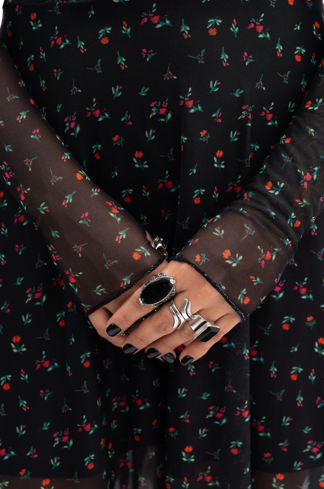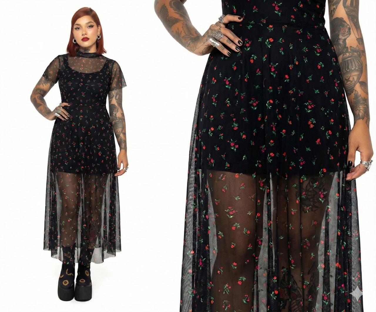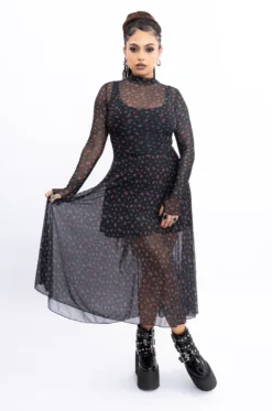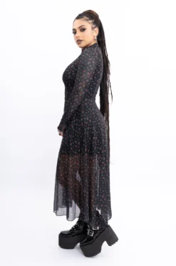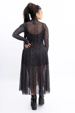 Vestido en dos piezas (forro interno y vestido largo) elaborado en malla, con abotonadura posterior, manga larga y asimetría entre largo delantero y posterior siendo el posterior más largo.