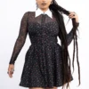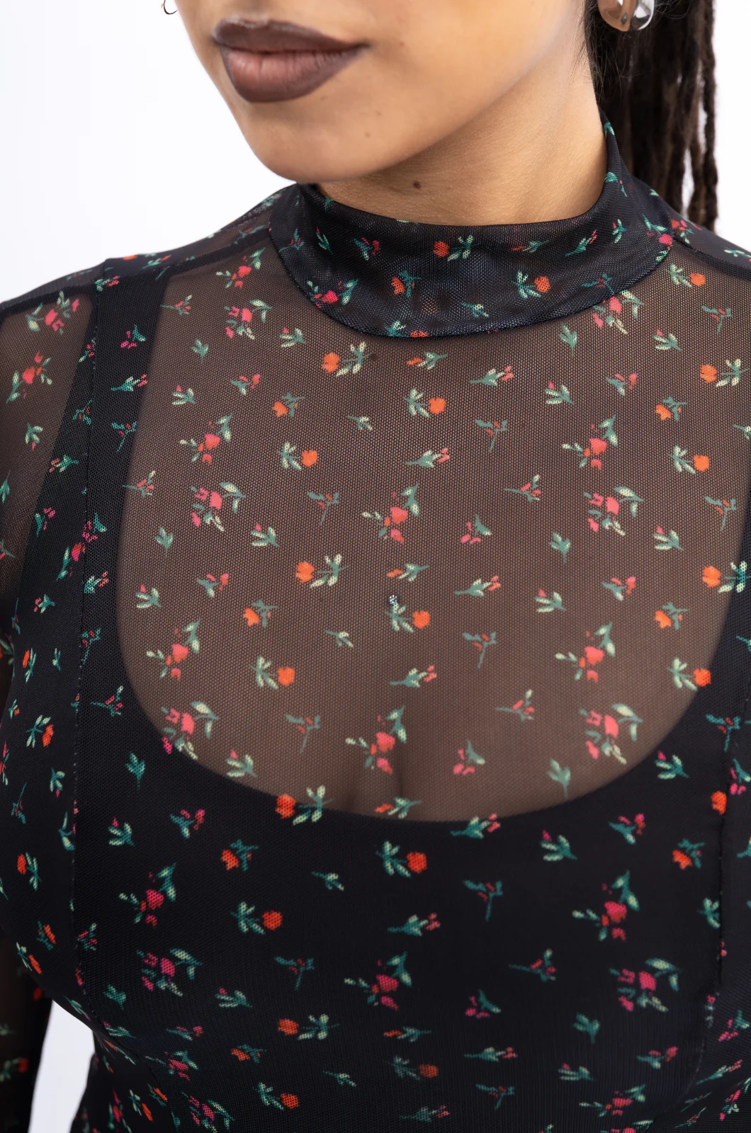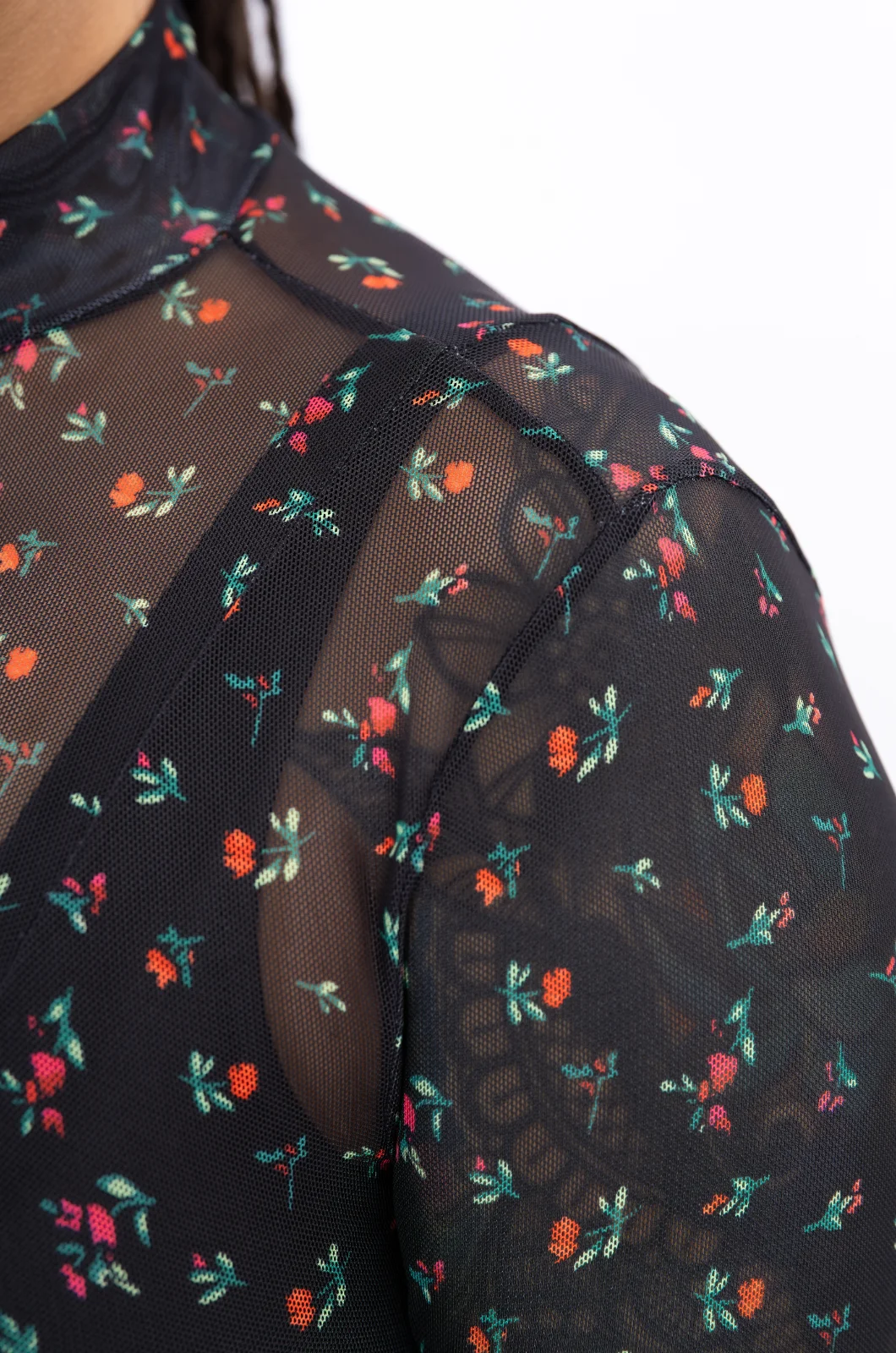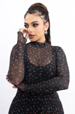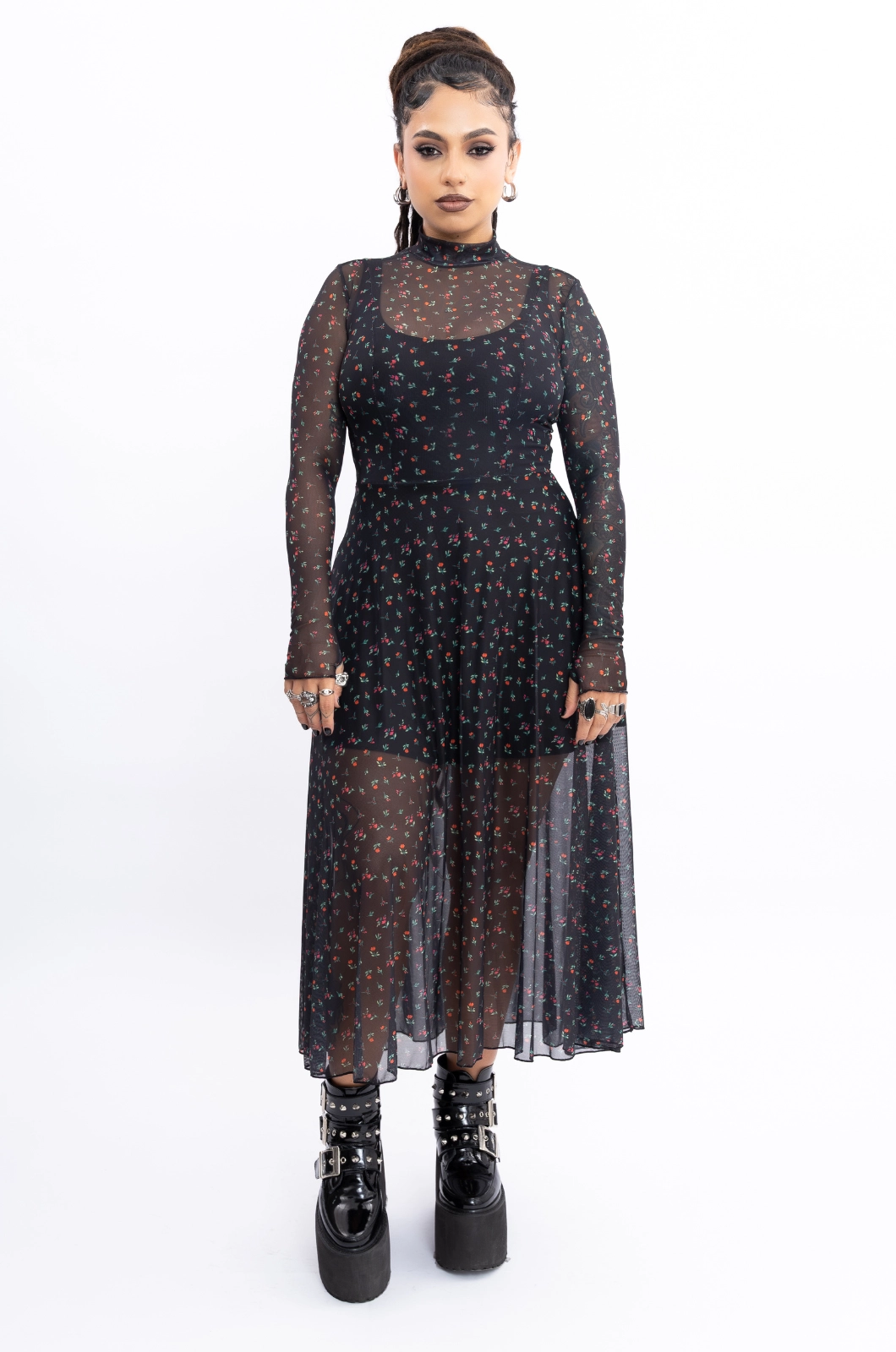 Vestido en dos piezas (forro interno y vestido largo) elaborado en malla, con abotonadura posterior, manga larga y asimetría entre largo delantero y posterior siendo el posterior más largo.